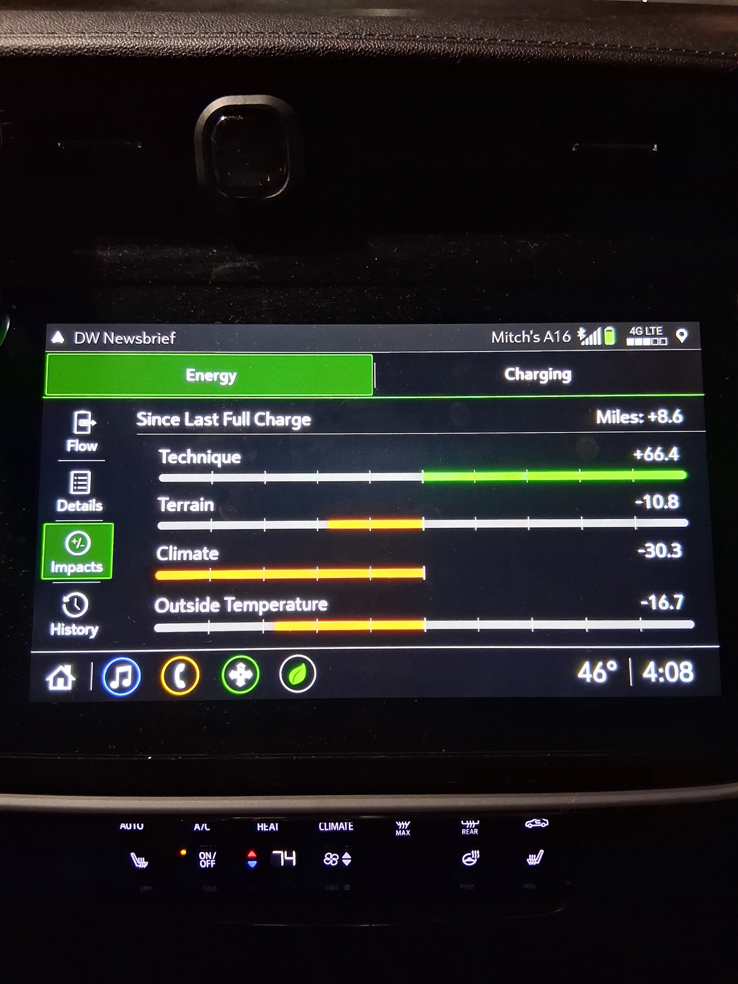 Cabin heating and windscreen defogfer accounts for 10-15 extra kW. Taking time into account, youre adding 25% more power. Leave the defogger on, and you are looking at figures closer to 10%. Negligible for a regular commute are climate control requirement.